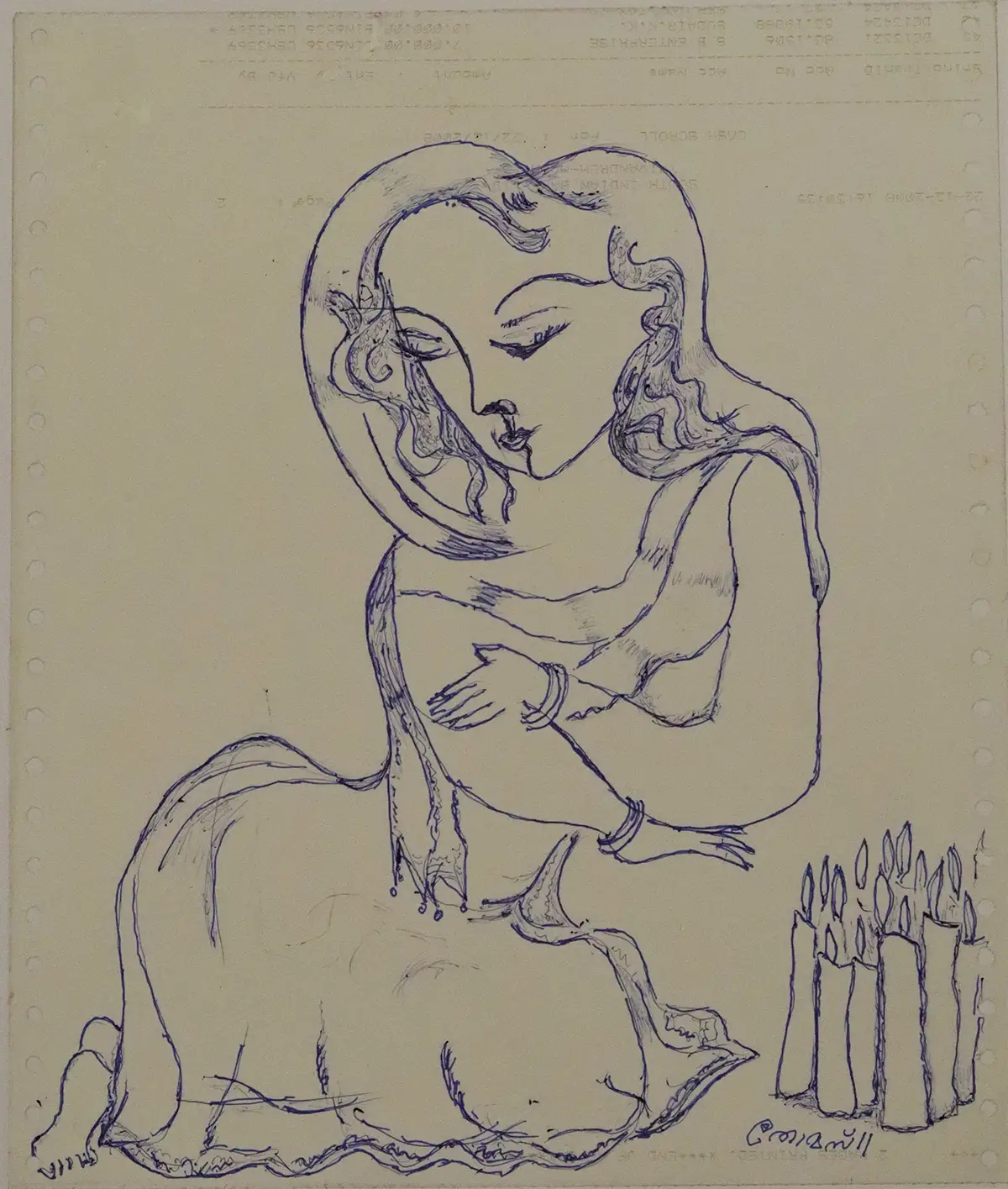 "Praying Girl" is an ink sketch on dot-matrix print, capturing a serene moment of devotion with delicate lines and contemplative grace.