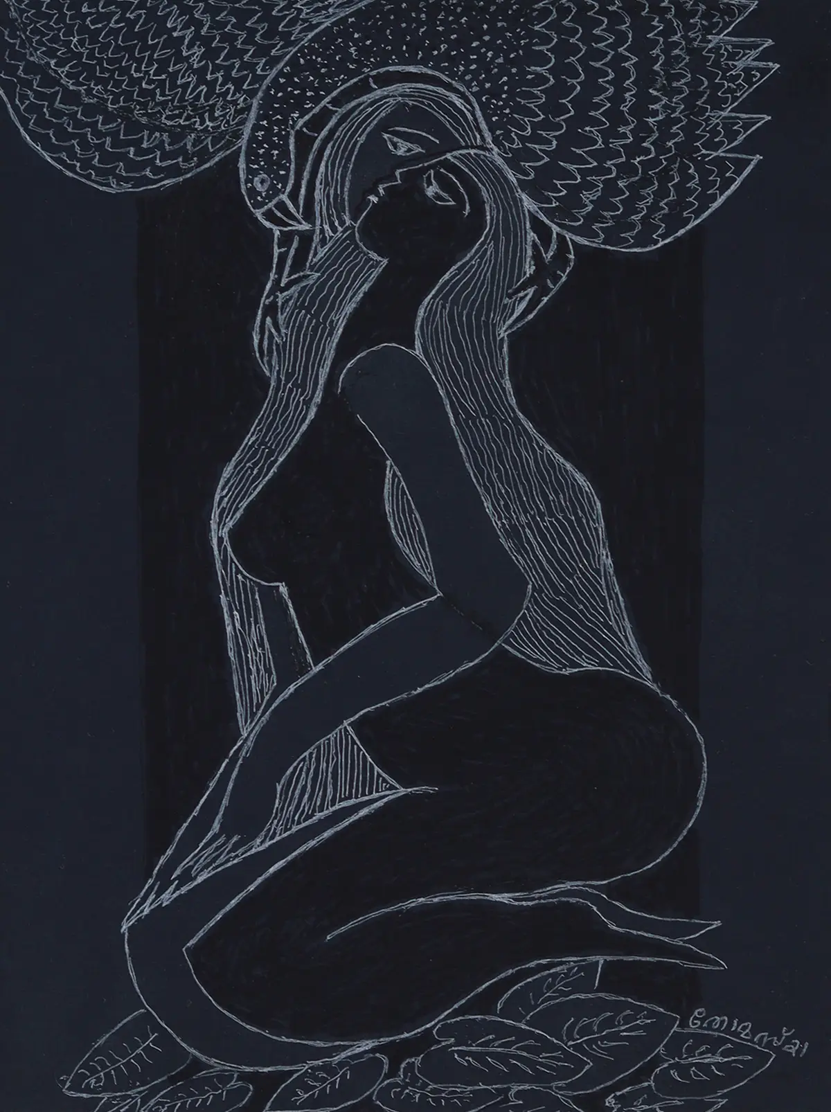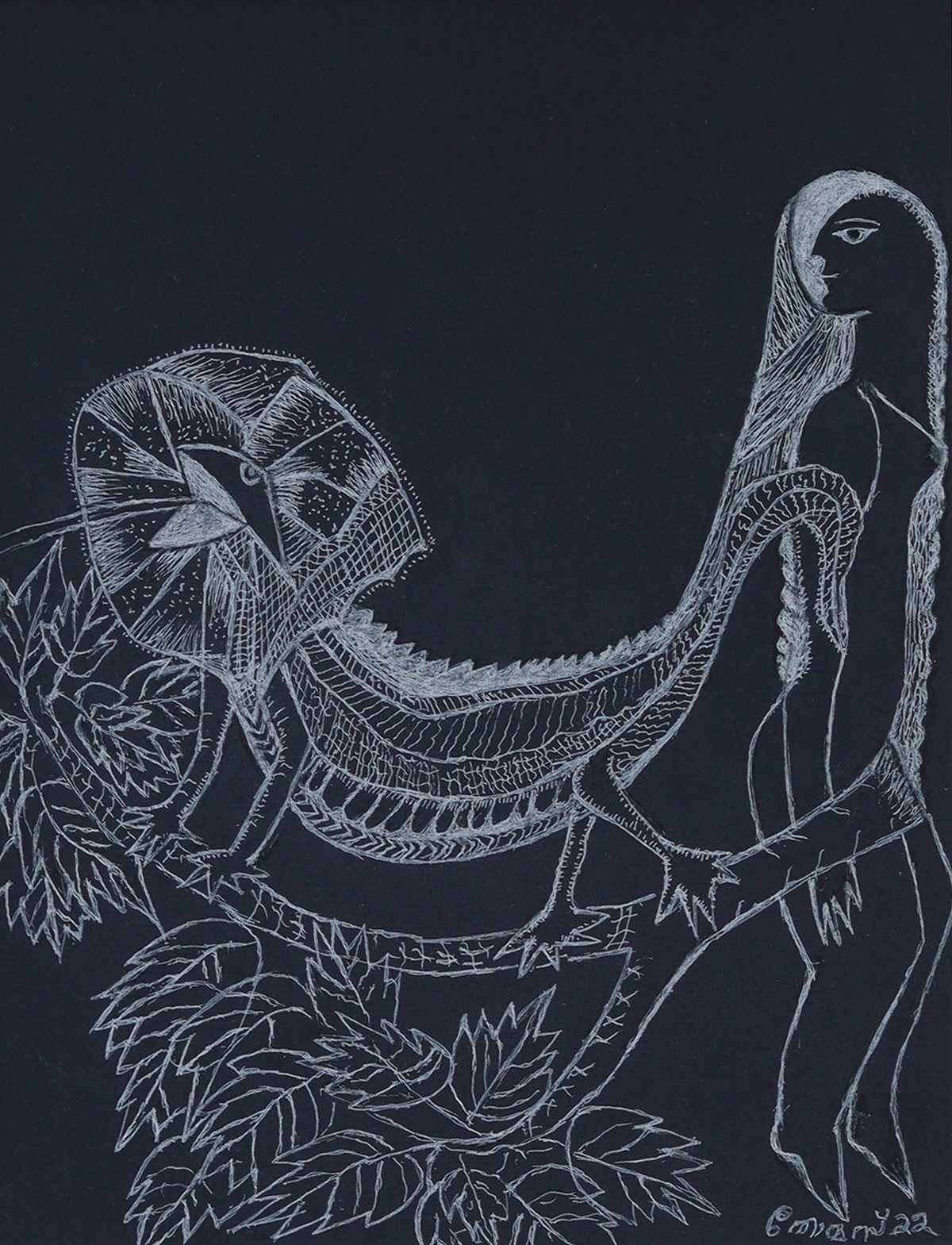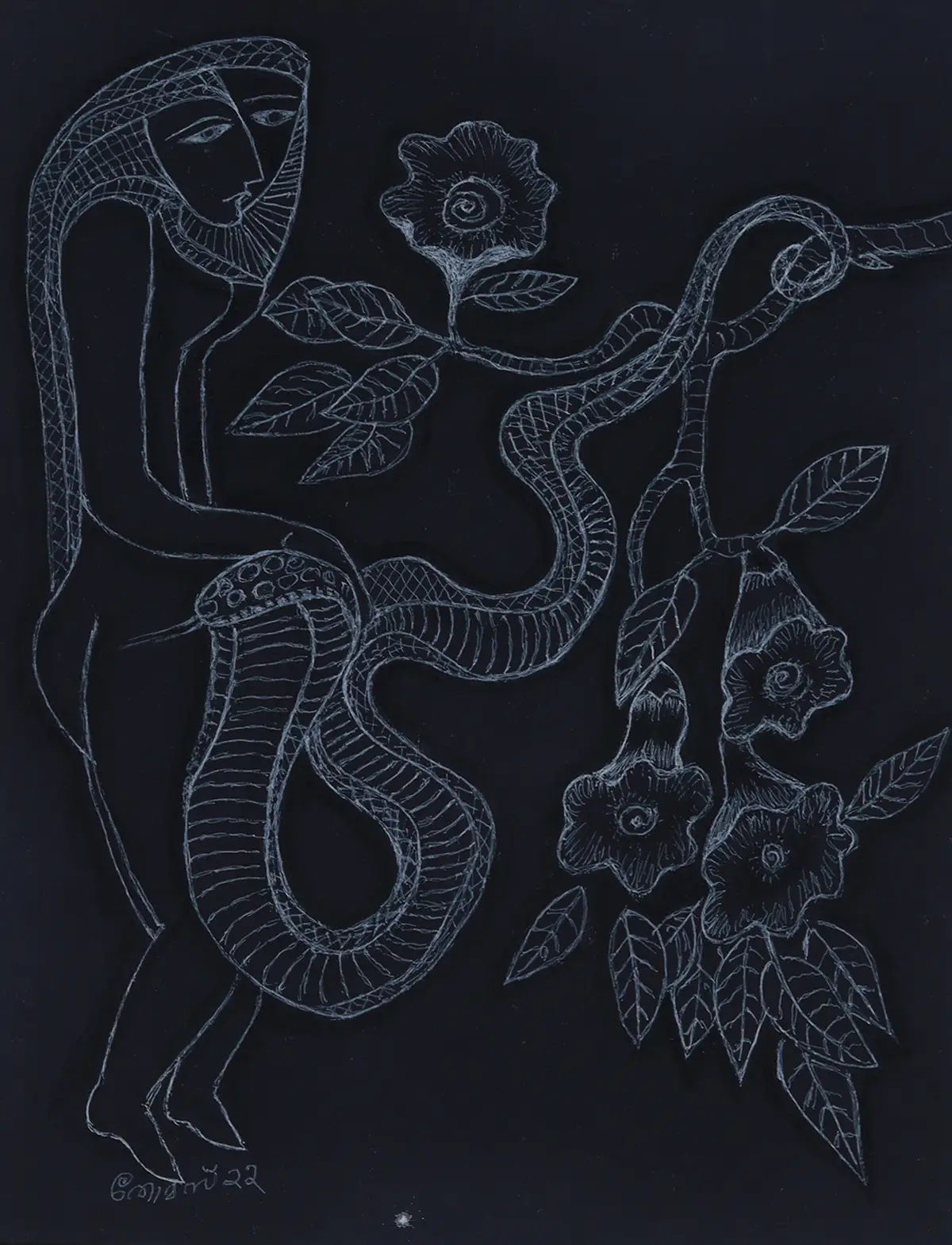 "Solitude" delves into introspection and quiet tension, rendered in striking white ink on black, depicting a girl entwined with a snake to evoke mystery, vulnerability, and inner strength.