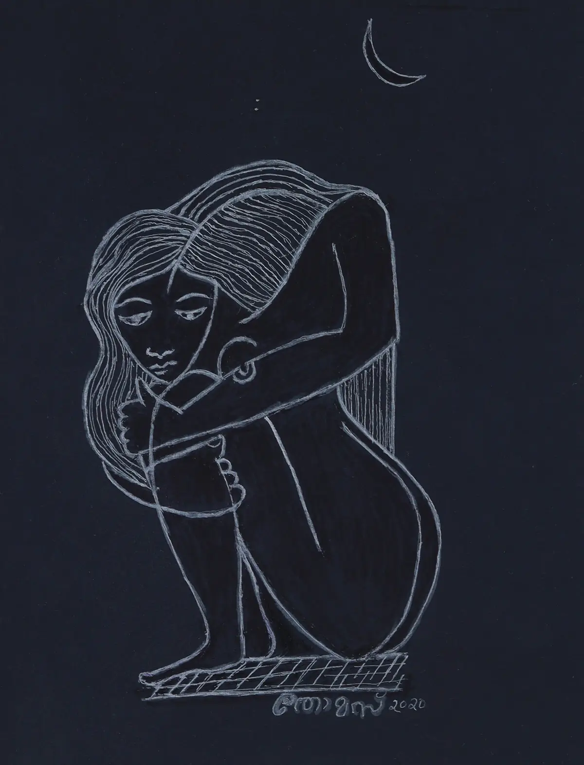 "Solitude" evokes quiet reflection, depicting a lone girl beneath a crescent moon on a stark black background, with delicate white ink capturing the serenity and introspection of night.