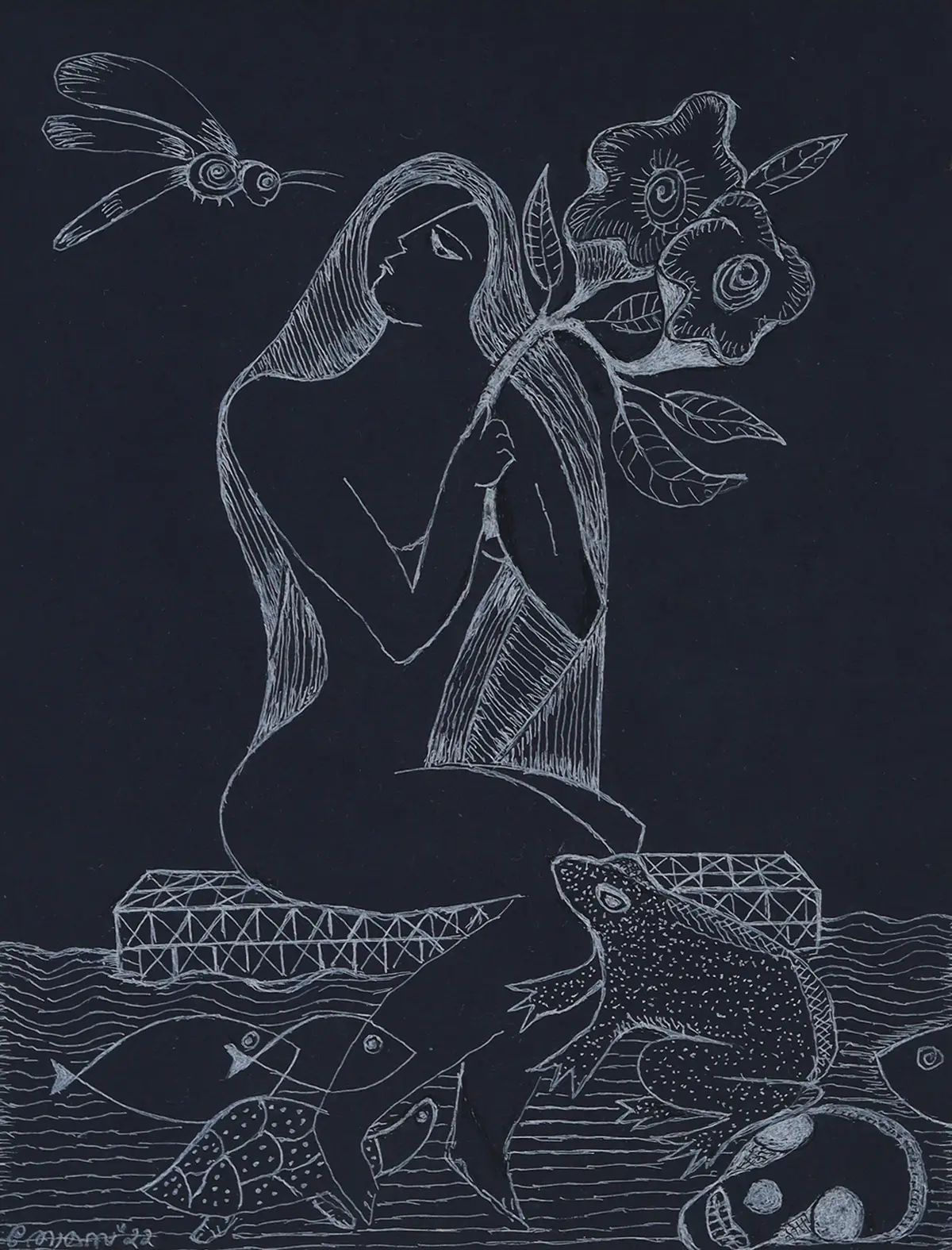"Solitude" evokes quiet introspection, rendered in striking white ink on a black background, featuring a girl in serene stillness as a delicate dragonfly hovers nearby, symbolizing reflection and fleeting moments of grace.